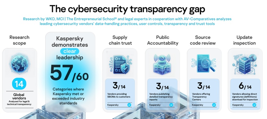 Nezavisna studija „Pregled transparentnosti i odgovornosti u sajber bezbednosti“, na kojoj se zasniva nova bela knjiga kompanije Kaspersky, naručena je od strane Privredne komore Tirola (WKO), a sproveli su je MCI | The Entrepreneurial School® i pravni stručnjaci, u saradnji sa organizacijom AV-Comparatives. Istraživanje je ocenjivalo dobavljače prema širokom spektru kriterijuma transparentnosti i odgovornosti. Nalazi su pokazali da, iako je osnovna usklađenost sa propisima široko rasprostranjena, mnoge proverljive prakse koje grade poverenje i dalje ostaju retkost u industriji.